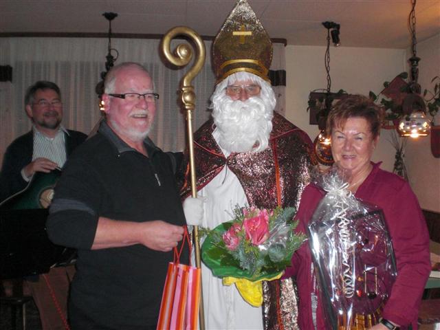 Der Nikolaus teilt seine Gaben an aus. links: Heiner Feldner (Schriftführer), rechts: Monika Schnell (Vorsitzende).
