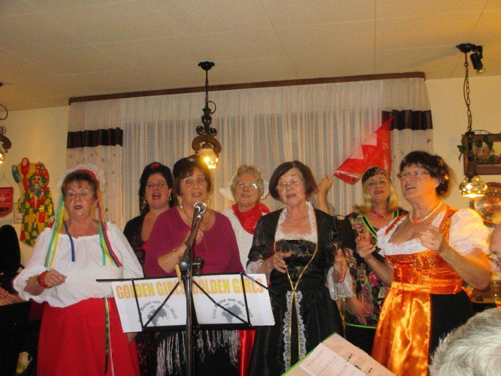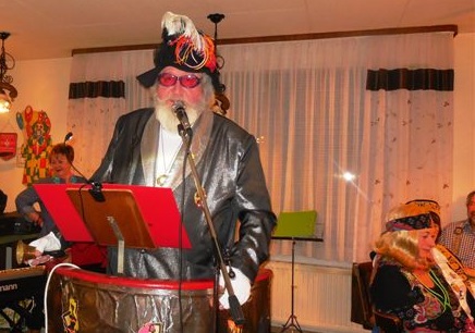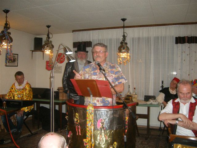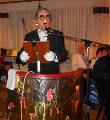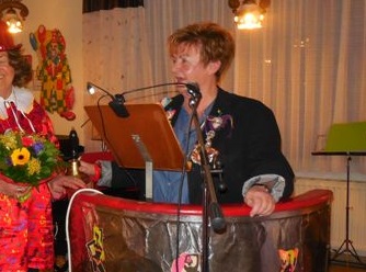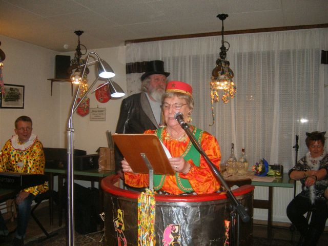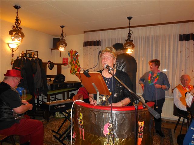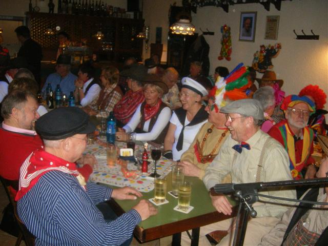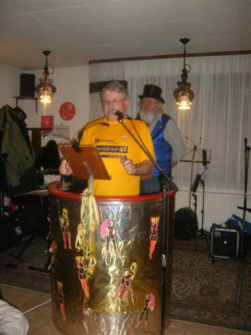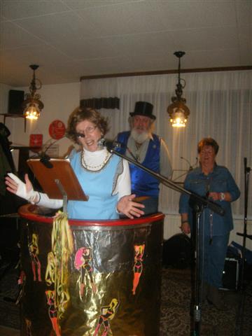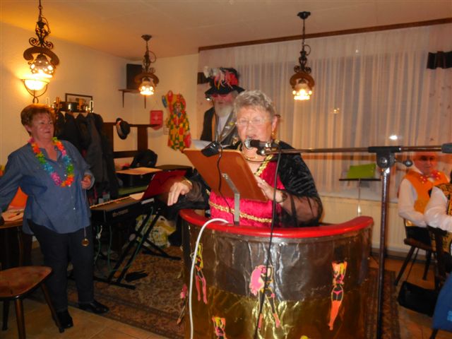 Begrüßung durch Monika Schnell. - Durch den Kappenabend führte in bewährter Weise Werner Simon. Den Reigen der Redner eröffnete traditionsgemäß Erika mit ihrem Protokoll. ![]() Beliebte Gaststars bei unserem Kappenabend: "Die Reservos". Hannelore wusste viel über das Berufsbild des Psychiaters zu berichten. ![]() Als Butler aus vornehmem Hause kam Harald - und danach die "Golden Girls" ![]() mit ihrem Programm "Eine Reise um die Welt", jeweils als Vertreterinnen der ![]() verschiedenen besungenen Länder. ![]() Helau und auf Wiedersehen.