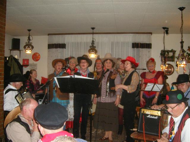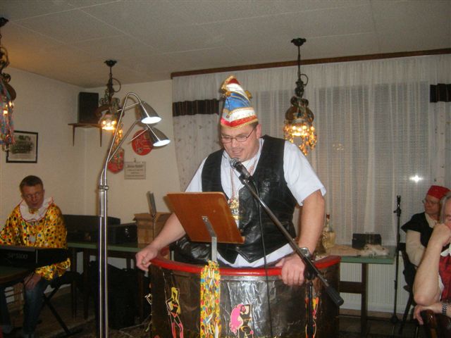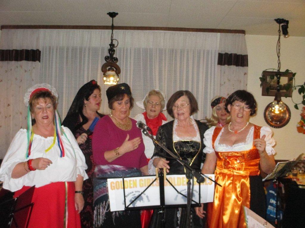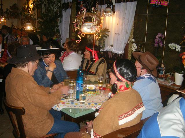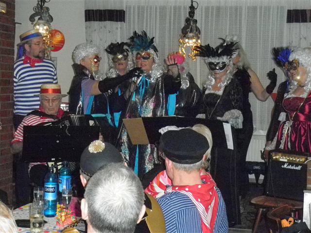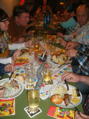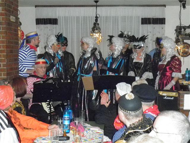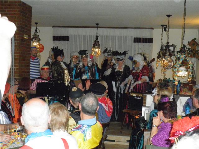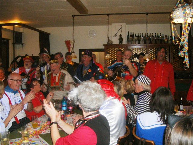 Begrüßung durch Monika Schnell. - Durch den Kappenabend führte in bewährter Weise Werner Simon. Den Reigen der Redner eröffnete traditionsgemäß Erika mit ihrem Protokoll. ![]() Beliebte Gaststars bei unserem Kappenabend: "Die Reservos". Hannelore wusste viel über das Berufsbild des Psychiaters zu berichten. ![]() Als Butler aus vornehmem Hause kam Harald - und danach die "Golden Girls" ![]() mit ihrem Programm "Eine Reise um die Welt", jeweils als Vertreterinnen der ![]() verschiedenen besungenen Länder. ![]() Helau und auf Wiedersehen.