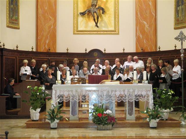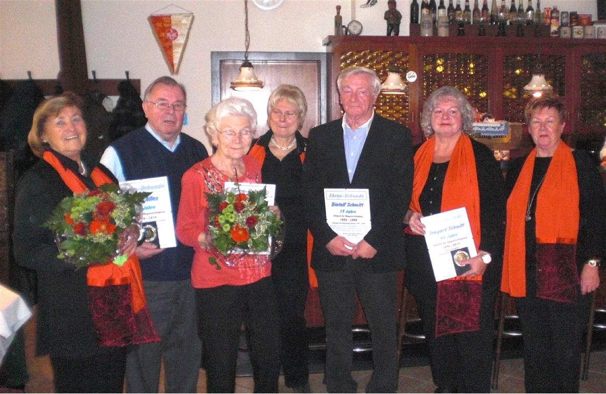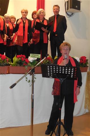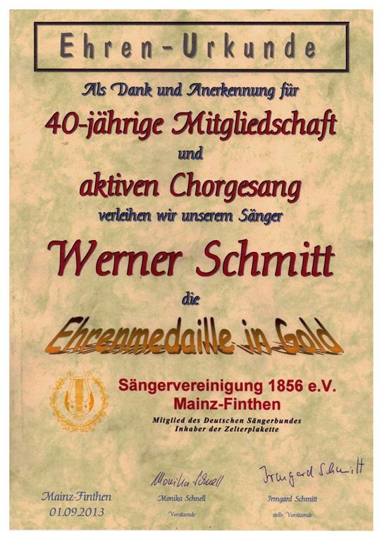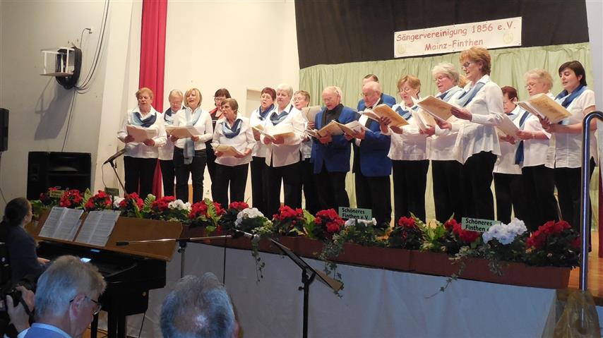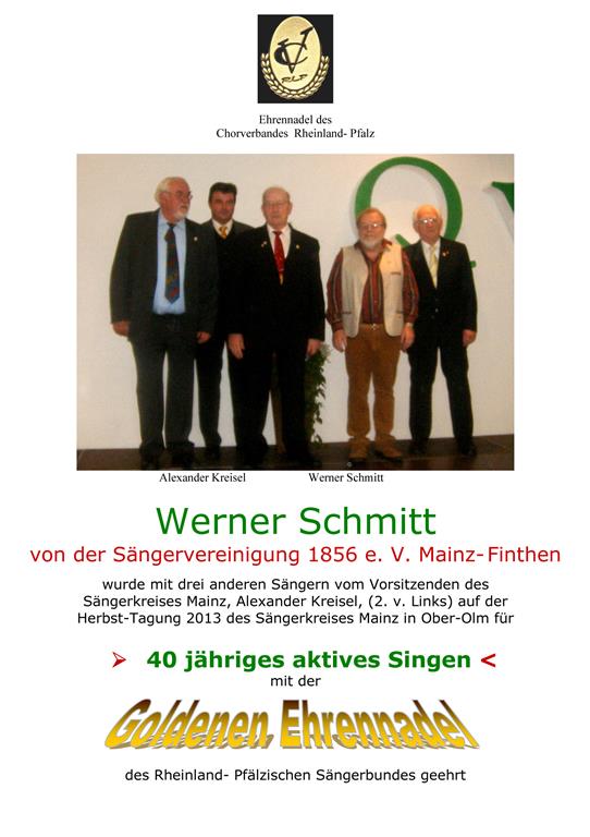 Anlässlich des 40. Geburtstages des Gemischten Chores gestaltete der Chor den Gottesdienst in der katholischen Kirche St. Martin Finthen mit einigen Werken aus der „Deutschen Messe von Schubert“ und dem „Ave Werum“ von Mozart gesanglich unter dem Dirigat von Chorleiter Fritz Brändle mit. Hausherr Pfarrer Christoph Zell begrüßte den Chor zum letzten Gottesdienst im Kirchenjahr 2014 und gab ihm den kirchlichen Segen zum weiteren Gedeihen. Zum Abschluss des Gottesdienstes sang der Chor noch die Gospels „Rock my Soul“ und „Heaven is A Wonderful Place“ und die Kirchenbesucher klatschten begeistert im Rhythmus mit. Nach dem Gottesdienst traf sich der Chor, und bei einem kleinen Sektempfang feierte der Verein das 40-jährige Bestehen des Gemischten Chores mit Ehrungen verdienter Sängerinnen und Sänger. Für 40 Jahre aktives Singen und für 40 jährige Mitgliedschaft sowie dem erstem Dirigenten des 1974 gegründeten gemischten Chores, Dietolf Schmitt, wurde herzlich gedankt. Unserem ehemaligen Sänger Hans wurde sogar für 60-jährige Treue zum Verein gedankt. Alle erhielten von der Vorsitzenden Monika Schnell neben einer Urkunde noch eine goldene Plakette des Vereines. Pfarrer Zell sowie Ortsvorsteher und Vereinsmitglied Herbert Schäfer waren auch bei der Feier anwesend und Schäfer sprach einige Grußworte und bedankte sich bei allen für die geleistete Chorarbeit in all den Jahren. Chronist Werner Schmitt
