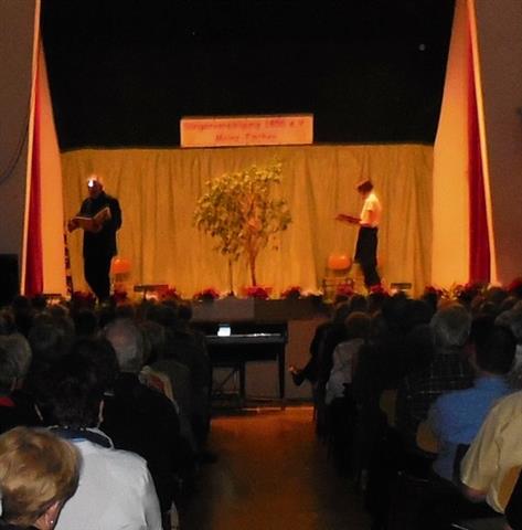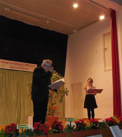 Szenische Lesung der Theatergruppe "Die Finthlinge" mit Eva Witzke und Michael Heinz. Mark Twain: "Aus dem Tagebuch von Adam und Eva". Regie Uwe Greiner. Die "Dantesingers", des MGV 1839 Mainz-Bretzenheim e. V. unter der Leitung von Dirigent Fritz Brändle. Fastnacht 2015